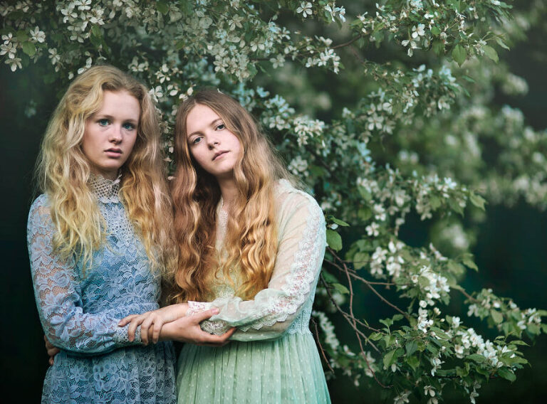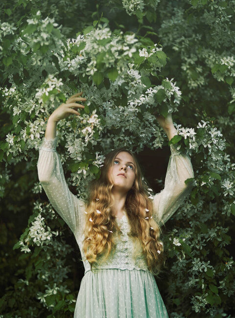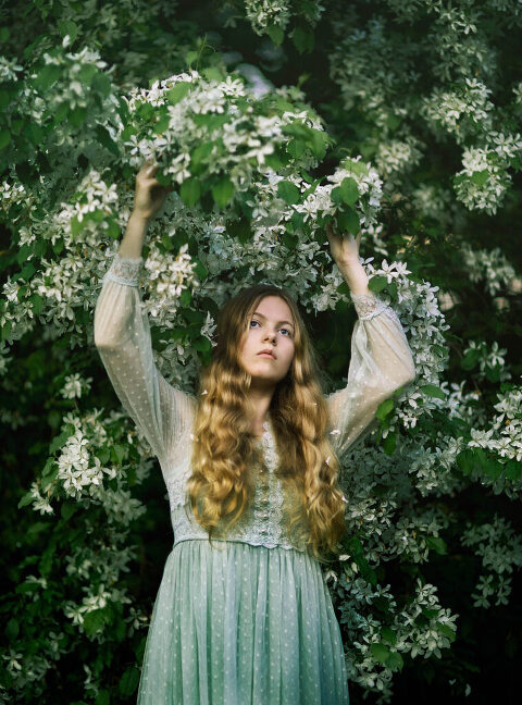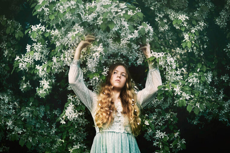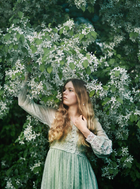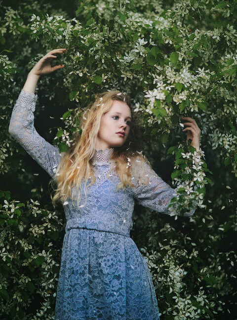 As an Upper Valley of NH and VT photographer, I am always looking for interesting places to do portrait photography. I love how the seasons change the landscapes so rapidly here in the Upper Valley and in New Hampshire. I noticed that there was a beautiful flowering tree in Hartland, VT that I absolutely needed to photograph with some portraits. I was feeling inspired, also, by some dresses that I had and got this “dollhouse” sensibility to my approach to this session. Enjoy these fine art portraits from that day.