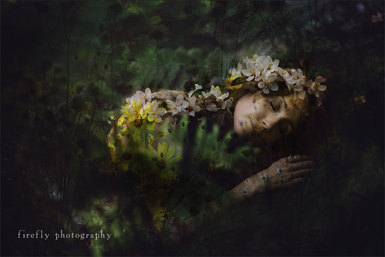 Artist Statement: In these large portraits and digital photographic collages, I combine a love of portraiture, a growing fascination with botany, reverence for the feminine, the cyclical nature of the seasons, the concept of impermanence, surrealism, and dreaminess. Increasingly fascinated by the Wheel of the Year and annual natural rhythms, I incorporate elements from nature into my photographic works. The temporary (and ephemeral) nature of things resonates deeply with me. For example, my costumes are usually assembled the day-of the shoot and models need to be flexible around changing weather conditions and optimal locations in terms of blooms. I enjoy working with fleeting elements in my images. In my digital photo collages, I layer photographs I have taken in nature over my portraits and dive deep in Photoshop working with layers, colors, textures and to create a finished image.